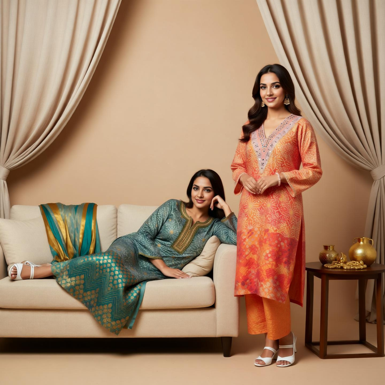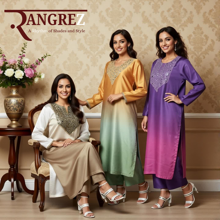 Each suit is a canvas of graceful transitions — from delicate blushes to deeper tones — adorned with mirror work that sparkles like desert stars. These mirrors aren’t just embellishments; they are storytellers, capturing your every move, every celebration, every moment of grace.